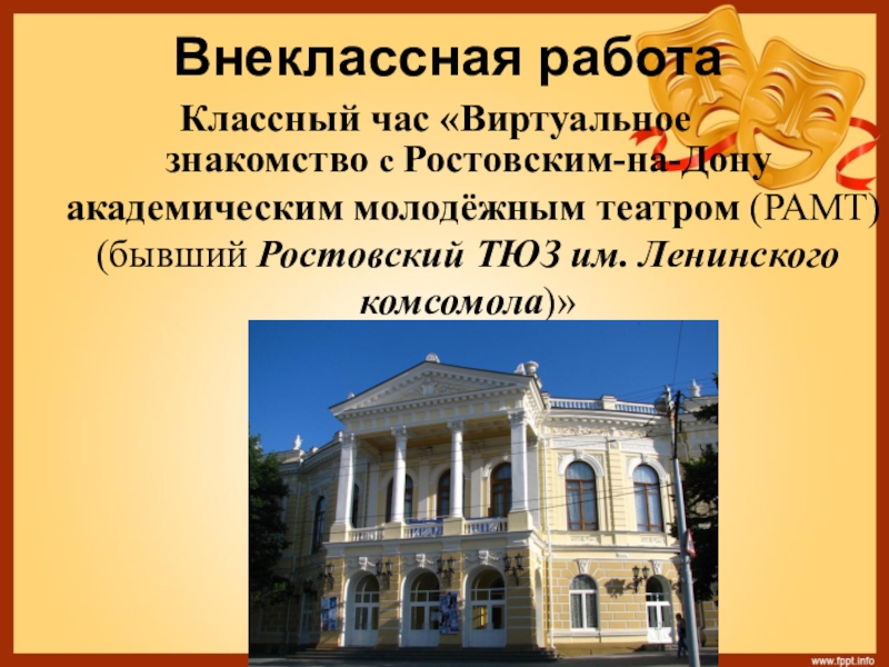 Слайд 22знакомство с Ростовским-на-Дону академическим молодёжным театром (РАМТ) (бывший Ростовский ТЮЗ им.