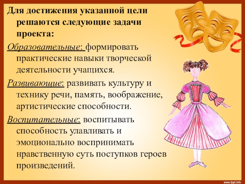 Развивающие: развивать культуру и технику речи, память, воображение, артистические способности.
