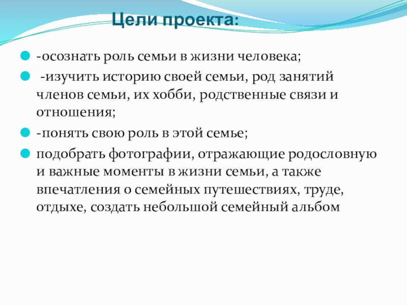 подобрать фотографии, отражающие родословную и важные моменты в жизни семьи, а также впечатления о семейных путешествиях, труде, отдыхе, создать небольшой семейный альбом