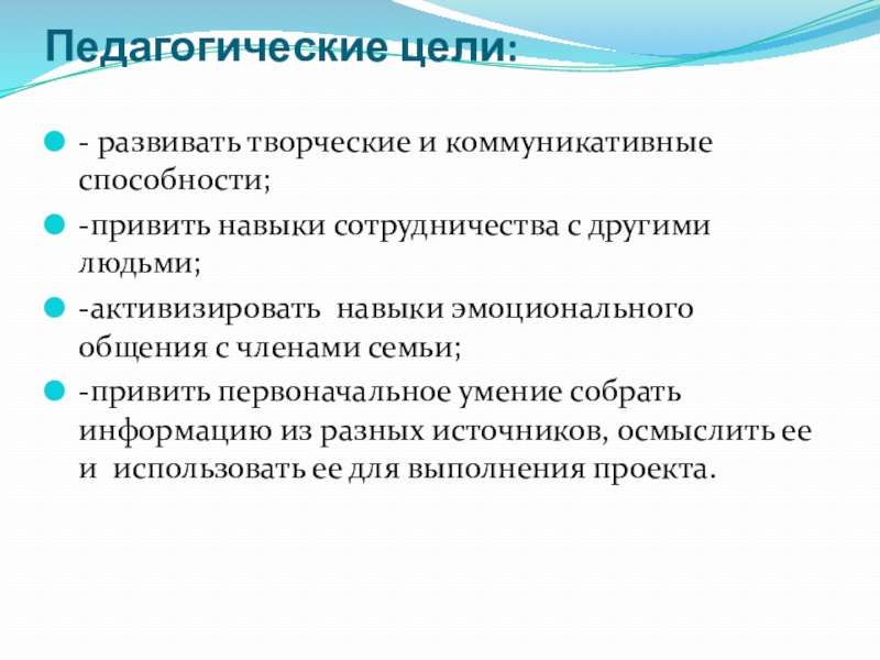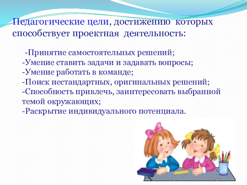 Слайд 7Педагогические цели, достижению которых способствует проектная деятельность:
