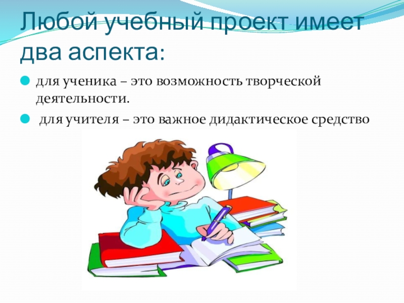 Слайд 5Учебный проект с точки зрения учителя - это дидактическое средство, позволяющее