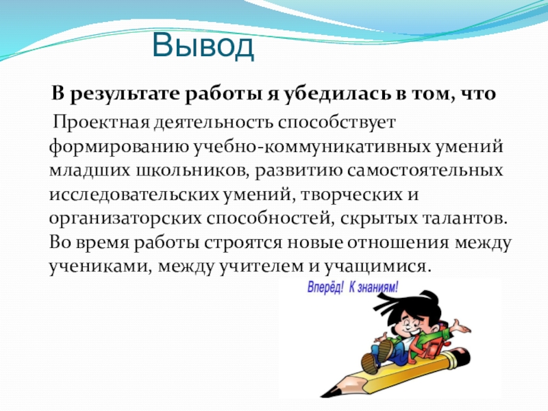 Проектная деятельность способствует формированию учебно-коммуникативных умений младших школьников, развитию самостоятельных исследовательских умений, творческих и организаторских способностей, скрытых талантов. Во время работы строятся новые отношения между учениками, между учителем и учащимися.