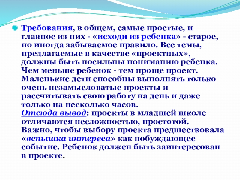 Слайд 10Требования к проектной деятельности младших школьников во многом отличаются от идеи