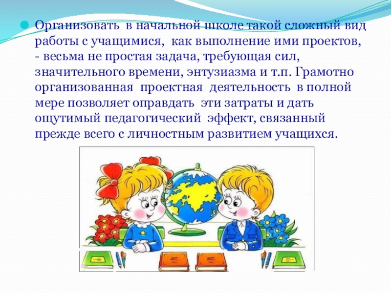 выполнение ими проектов, - весьма не простая задача, требующая сил, значительного времени, энтузиазма и т.п. Грамотно организованная проектная деятельность в полной мере позволяет оправдать эти затраты и дать ощутимый педагогический эффект, связанный прежде всего с личностным развитием учащихся.