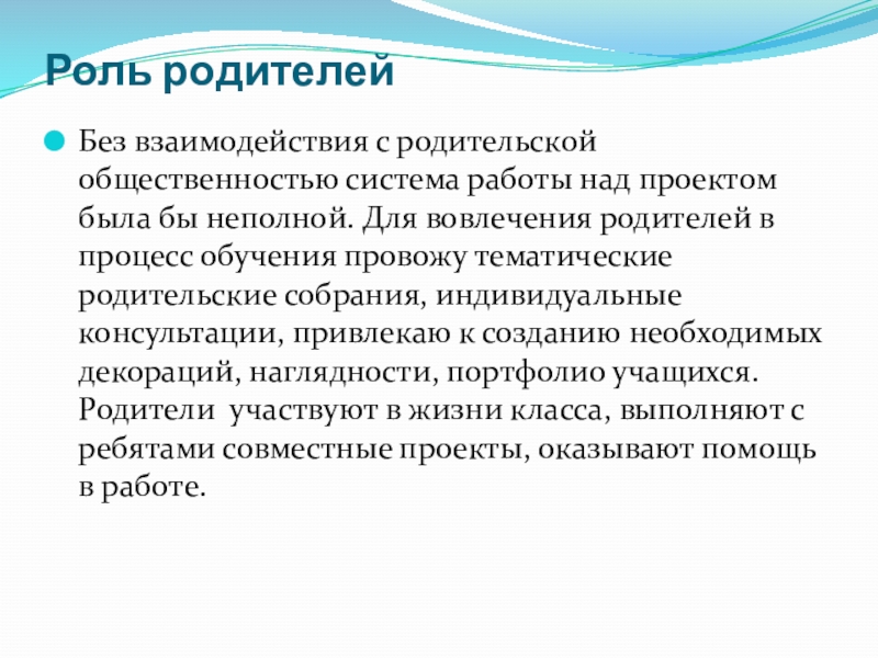 бы неполной. Для вовлечения родителей в процесс обучения провожу тематические родительские собрания, индивидуальные консультации, привлекаю к созданию необходимых декораций, наглядности, портфолио учащихся. Родители участвуют в жизни класса, выполняют с ребятами совместные проекты, оказывают помощь в работе.