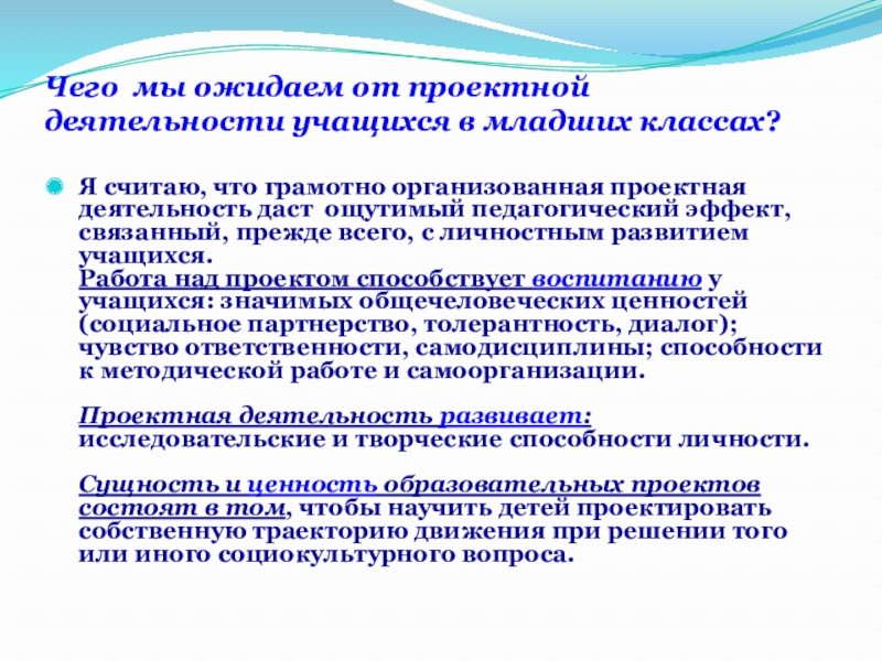 Слайд 36Чего мы ожидаем от проектной деятельности учащихся в младших классах?