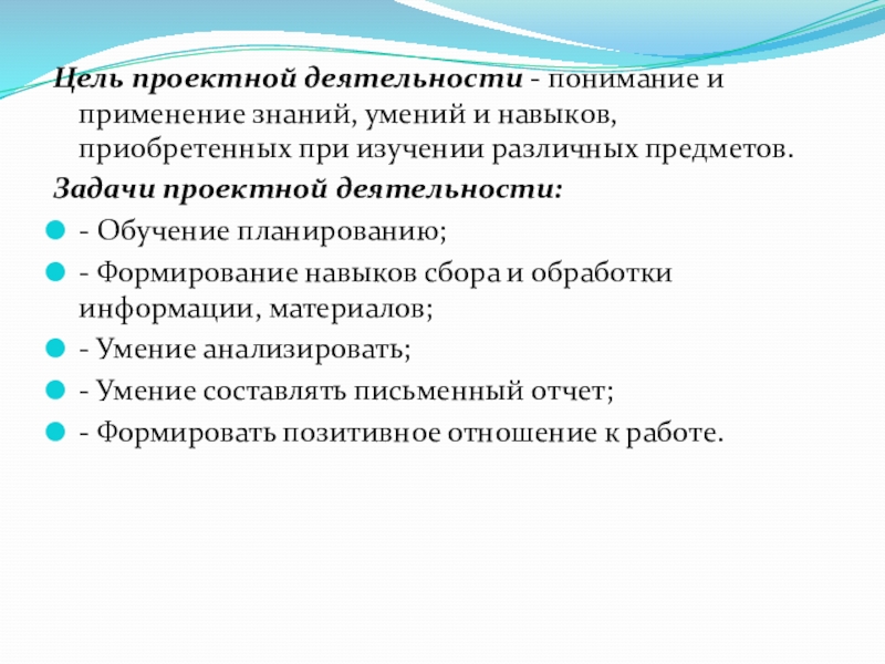 Слайд 6Цель проектной деятельности - понимание и применение знаний, умений и навыков,