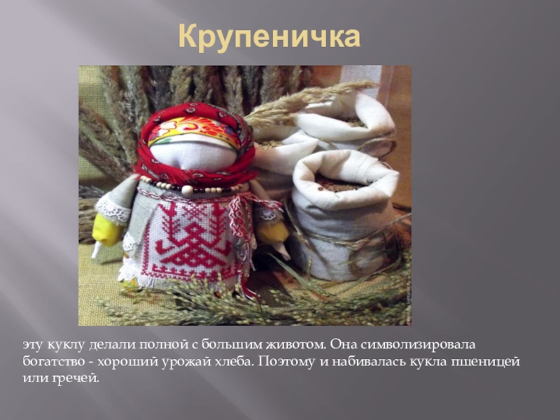 Крупеничкаэту куклу делали полной с большим животом. Она символизировала богатство - хороший урожай хлеба. Поэтому и набивалась
