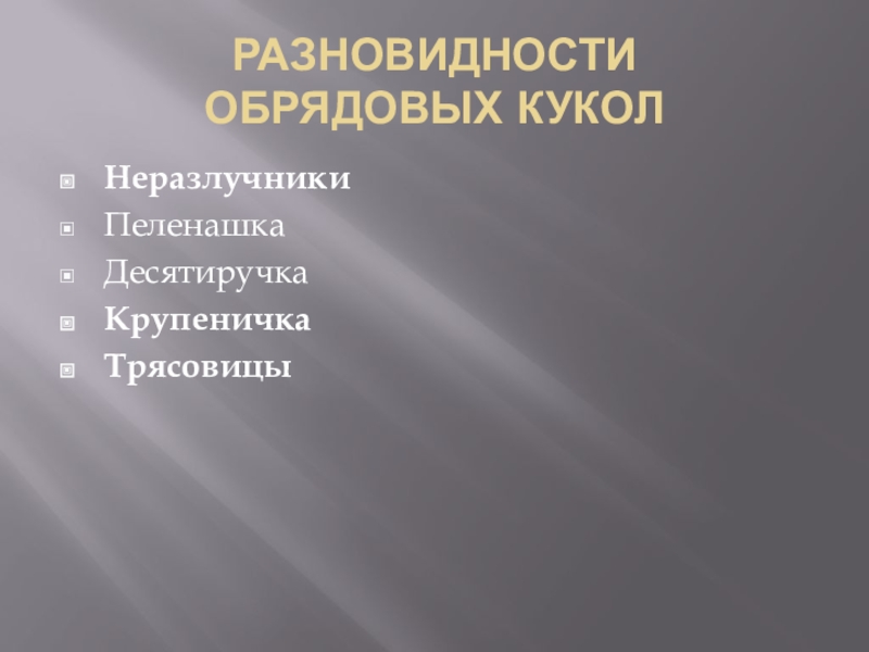 РАЗНОВИДНОСТИ ОБРЯДОВЫХ КУКОЛНеразлучники ПеленашкаДесятиручкаКрупеничкаТрясовицы