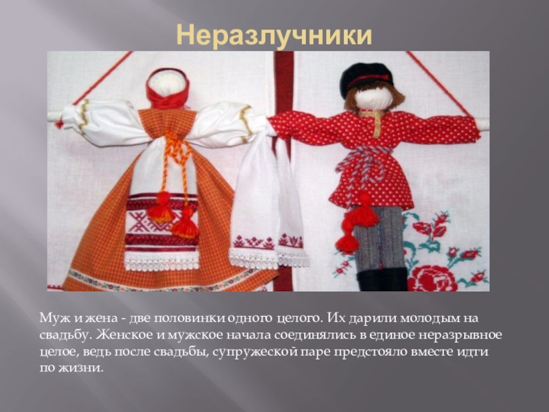 Неразлучники Муж и жена - две половинки одного целого. Их дарили молодым на свадьбу. Женское и мужское