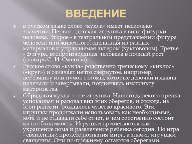 ВВЕДЕНИЕв русском языке слово «кукла» имеет несколько значений. Первое - детская игрушка в виде фигурки человека. Второе