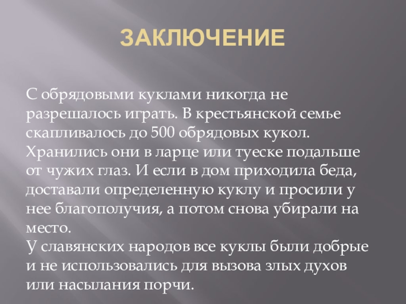 ЗАКЛЮЧЕНИЕС обрядовыми куклами никогда не разрешалось играть. В крестьянской семье скапливалось до 500 обрядовых кукол. Хранились они