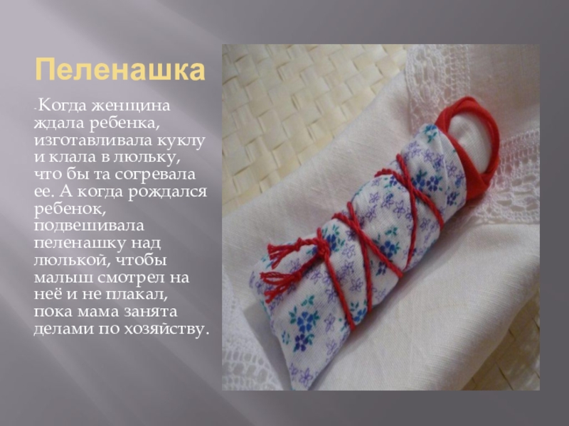 Пеленашка - Когда женщина ждала ребенка, изготавливала куклу и клала в люльку, что бы та согревала ее.
