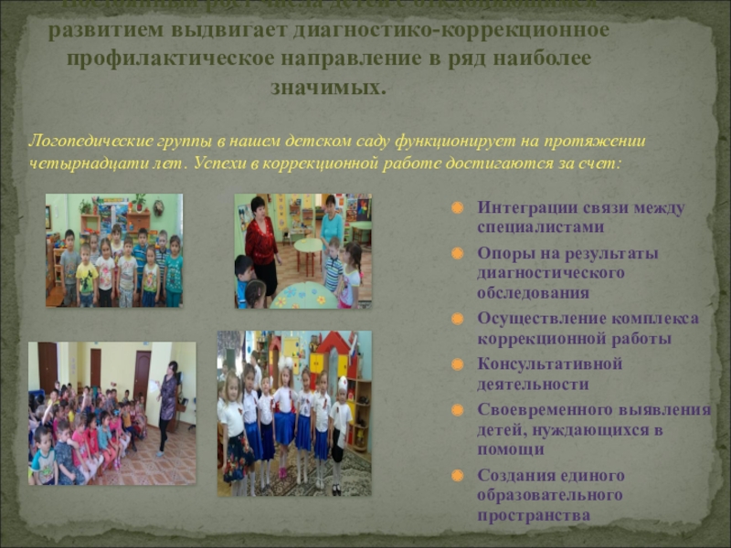 Логопедические группы в нашем детском саду функционирует на протяжении четырнадцати лет. Успехи в коррекционной работе достигаются за счет:
