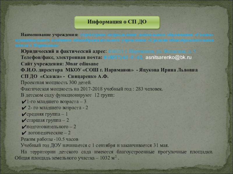 1.09.2017г. – переименовано в СП ДО «Сказка» МКОУ «СОШ г. Нариманов»