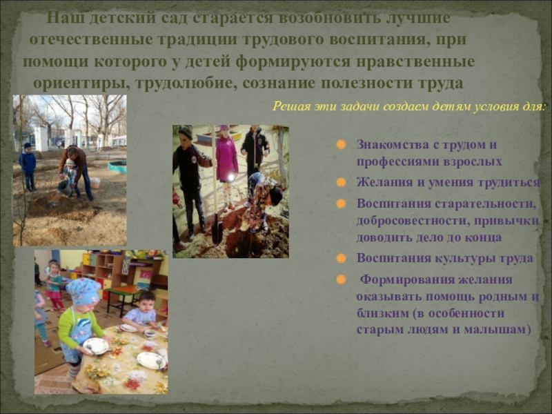 лучшие отечественные традиции трудового воспитания, при помощи которого у детей формируются нравственные ориентиры, трудолюбие, сознание полезности труда