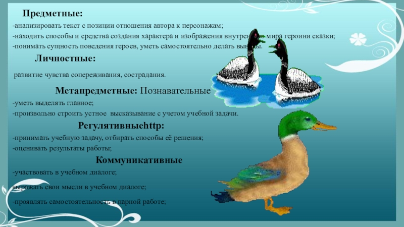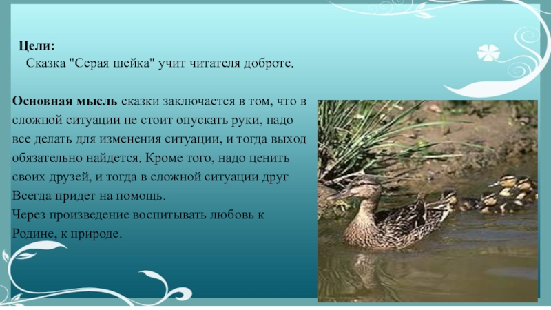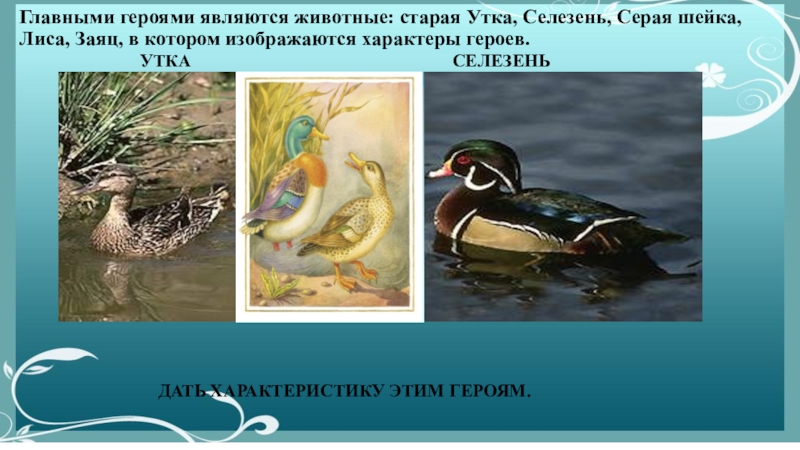 Селезень равнодушный эгоист: Селезень всегда старался замять разговор, когда речь заходила о Серой Шейке. Конечно, он тоже любил ее, но зачем же напрасно тревожить себя? Ну, останется, ну, замерзнет, - жаль, конечно, а все-таки ничего не поделаешь. Наконец, нужно подумать и о других детях. Жена вечно волнуется, а нужно смотреть на вещи серьезно. Селезень про себя жалел жену, но не понимал в полной мере ее материнского горя. Уж лучше было бы, если бы тогда Лиса совсем съела Серую Шейку, - ведь все равно она должна погибнуть зимой.