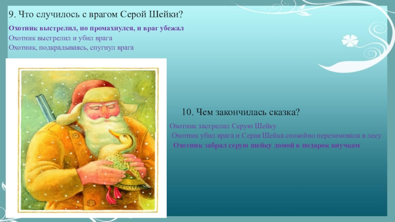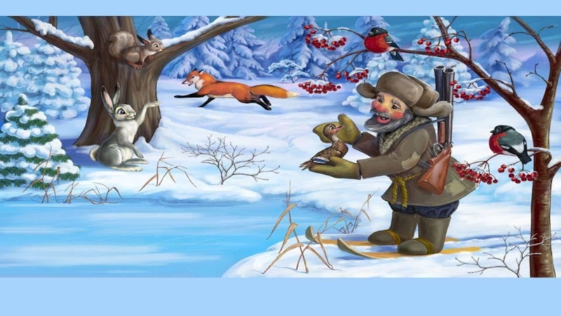 Добродушный старичок Акинтич друг и защитник природы: - Ах, глупая, глупая... Да ведь ты замерзнешь тут или Лиса тебя съест! Да...Старичок подумал-подумал, покачал головой и решил: отнести внучки.
