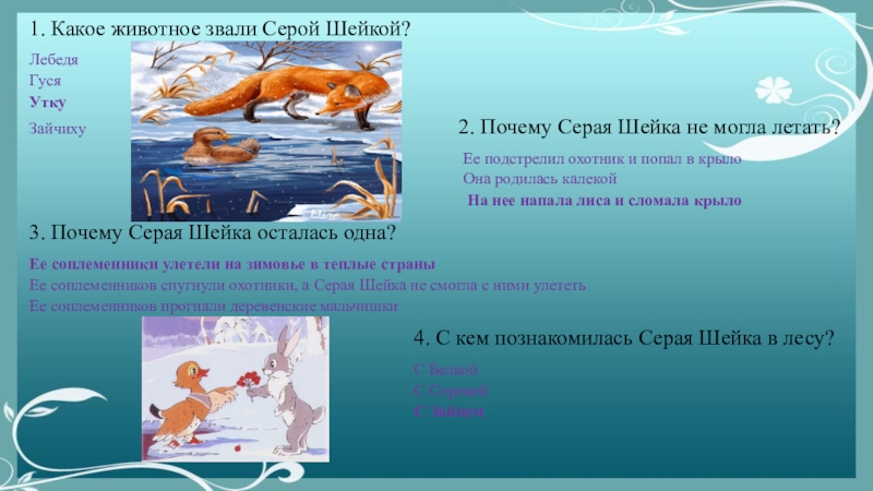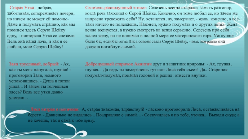 Лиса хитрая и ценичная: А, старая знакомая, здравствуй! - ласково проговорила Лиса, останавливаясь на берегу. - Давненько не видались... Поздравляю с зимой…- Соскучилась я по тебе, уточка... Выходи сюда; а не хочешь, так я сама к тебе приду.