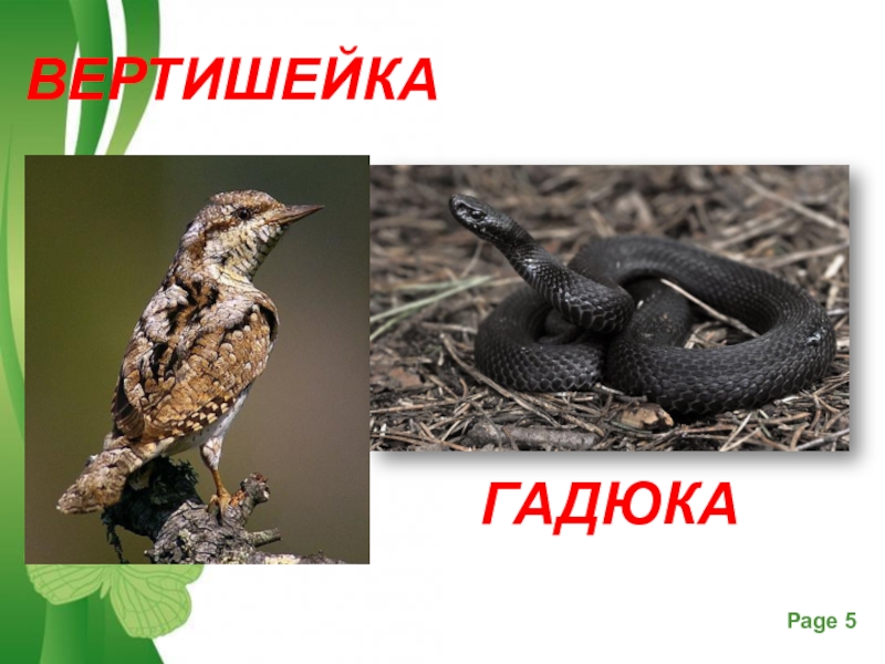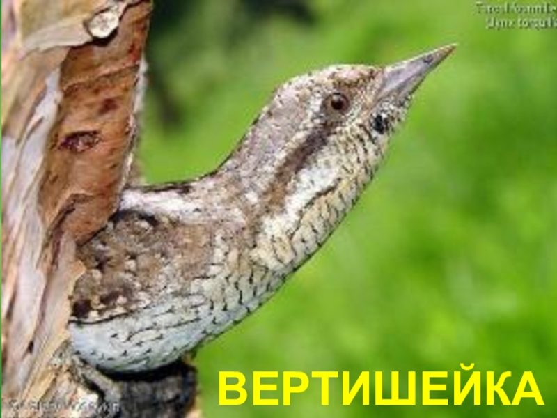 Это вертишейка. Когда ей грозит беда, она вытягивает шею и шипит, как гадюка.