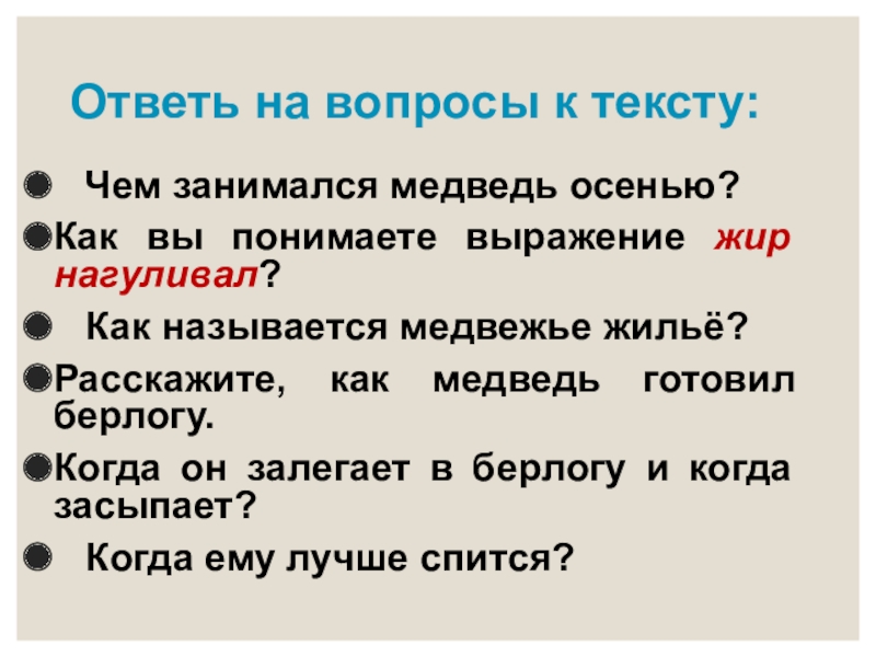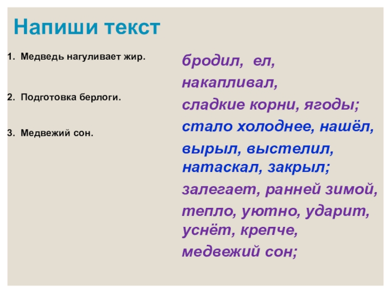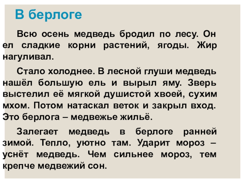 медведь, бродил, по лесу, сладкие, жир, холоднее, глуши, большую, выстелил, мягкой, душистой, натаскал, вход, медвежье, жильё, залегает, ранней, тепло, сильнее.