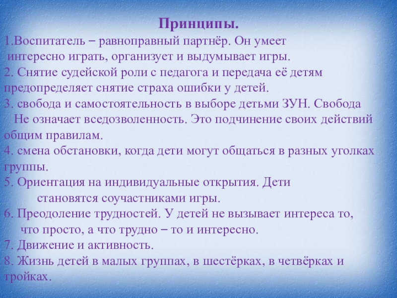 Принципы.1.Воспитатель – равноправный партнёр. Он умеет интересно играть, организует и выдумывает игры.2. Снятие судейской роли с педагога