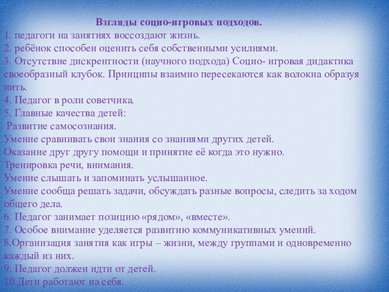 3. Отсутствие дискрентности (научного подхода) Социо- игровая дидактика своеобразный клубок. Принципы взаимно пересекаются как волокна образуя нить.