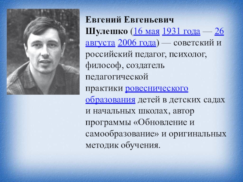Слайд 2Евгений Евгеньевич Шулешко (16 мая 1931 года — 26 августа 2006 года) — советский и российский