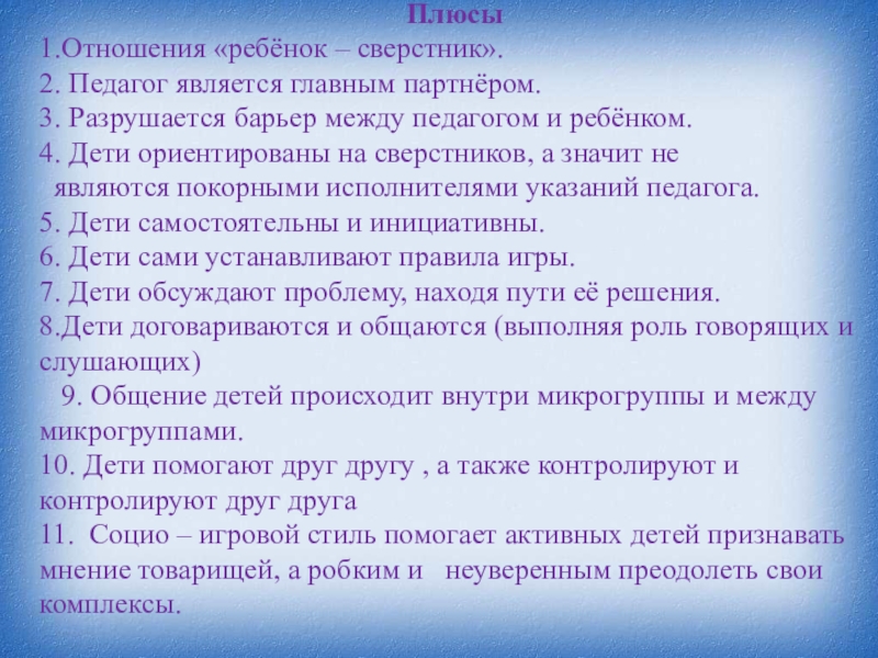 11. Социо – игровой стиль помогает активных детей признавать мнение товарищей, а робким и неуверенным преодолеть свои комплексы.