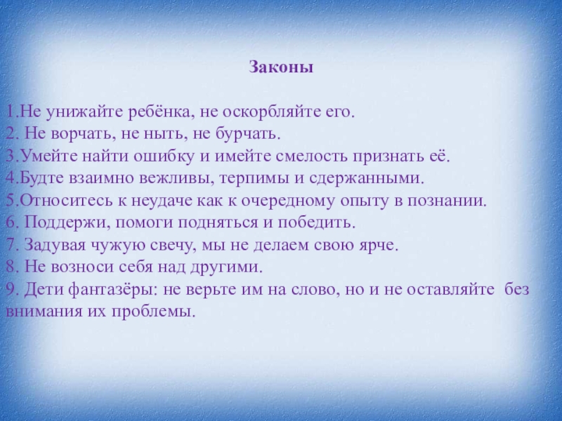 Законы1.Не унижайте ребёнка, не оскорбляйте его.2. Не ворчать, не ныть, не бурчать.3.Умейте найти ошибку и имейте смелость