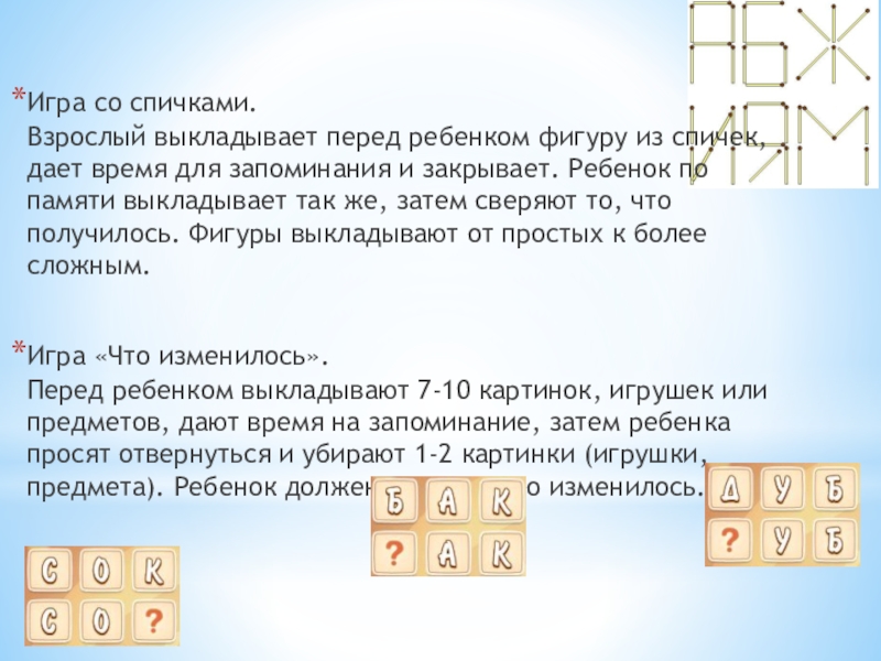 Слайд 3Игра со спичками. Взрослый выкладывает перед ребенком фигуру из спичек, дает время