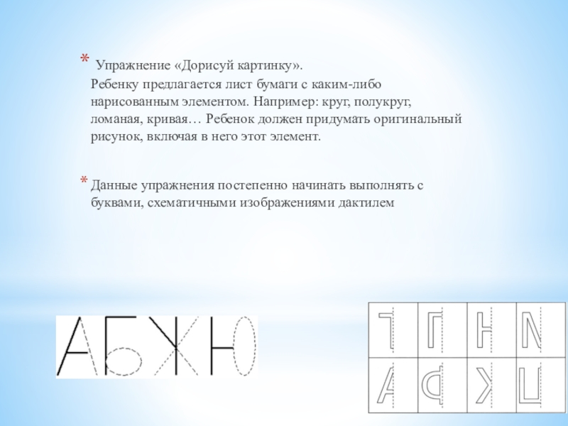 Слайд 4 Упражнение «Дорисуй картинку». Ребенку предлагается лист бумаги с каким-либо нарисованным элементом.