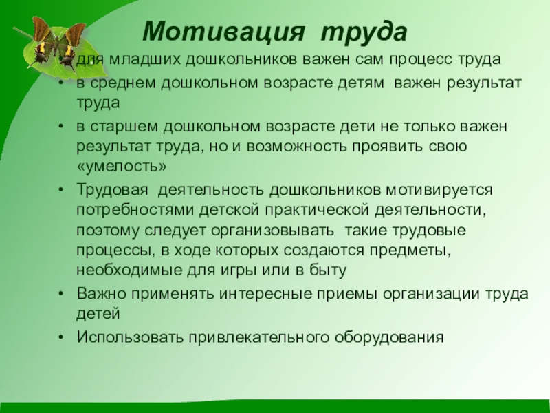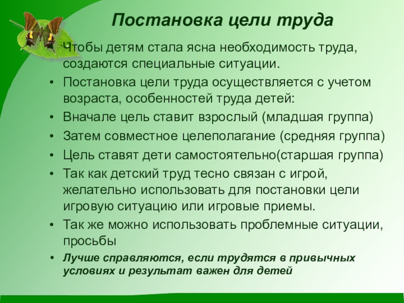 Постановка цели труда осуществляется с учетом возраста, особенностей труда детей: