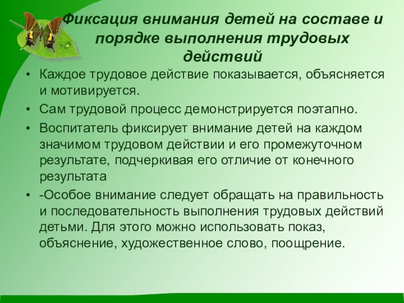 -Особое внимание следует обращать на правильность и последовательность выполнения трудовых действий детьми. Для этого можно использовать показ, объяснение, художественное слово, поощрение.