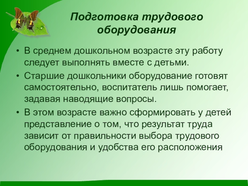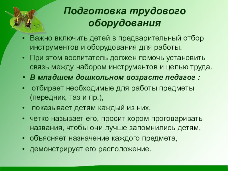 При этом воспитатель должен помочь установить связь между набором инструментов и целью труда.
