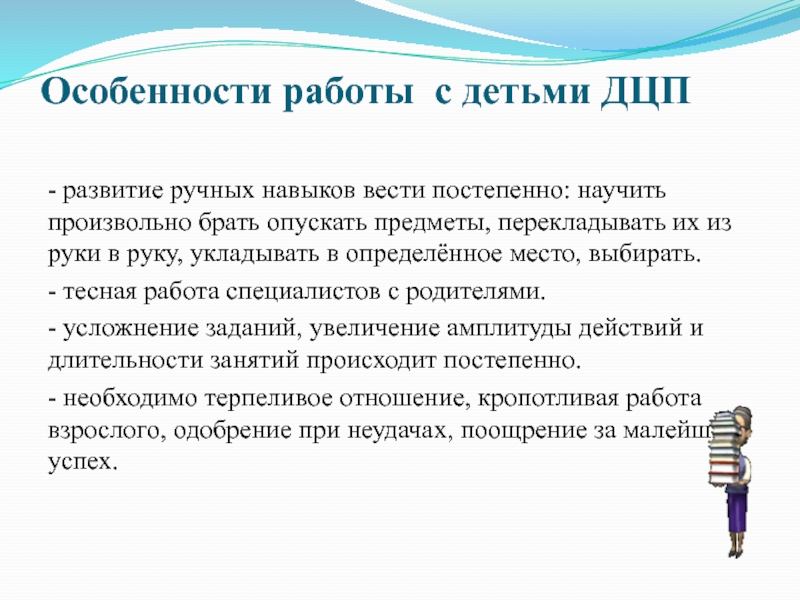 Слайд 14Особенности работы с детьми ДЦП