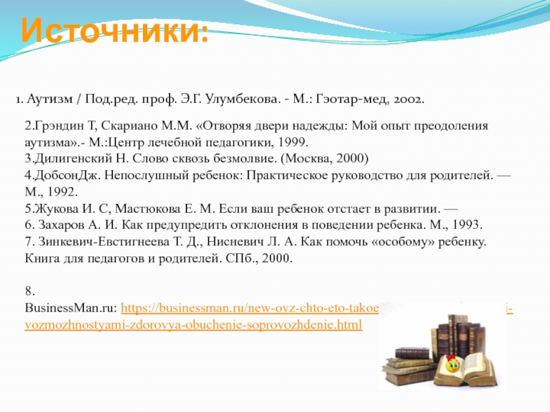 1. Аутизм / Под.ред. проф. Э.Г. Улумбекова. - М.: Гэотар-мед, 2002.