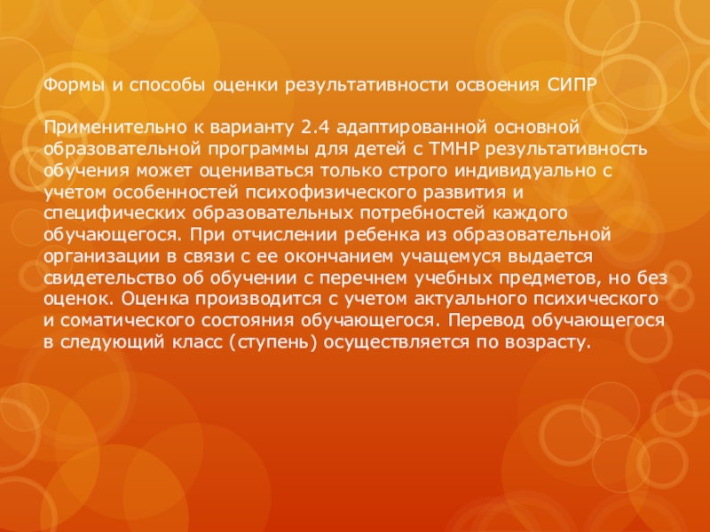 основной образовательной программы для детей с ТМНР результативность обучения может оцениваться только строго индивидуально с учетом особенностей психофизического развития и специфических образовательных потребностей каждого обучающегося. При отчислении ребенка из образовательной организации в связи с ее окончанием учащемуся выдается свидетельство об обучении с перечнем учебных предметов, но без оценок. Оценка производится с учетом актуального психического и соматического состояния обучающегося. Перевод обучающегося в следующий класс (ступень) осуществляется по возрасту.