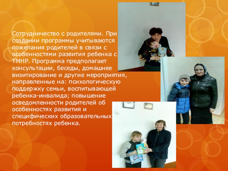 с особенностями развития ребенка с ТМНР. Программа предполагает консультации, беседы, домашнее визитирование и другие мероприятия, направленные на: психологическую поддержку семьи, воспитывающей ребенка-инвалида; повышение осведомленности родителей об особенностях развития и специфических образовательных потребностях ребенка.
