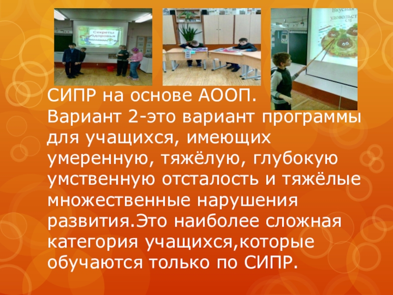 вариант программы для учащихся, имеющих умеренную, тяжёлую, глубокую умственную отсталость и тяжёлые множественные нарушения развития.Это наиболее сложная категория учащихся,которые обучаются только по СИПР.