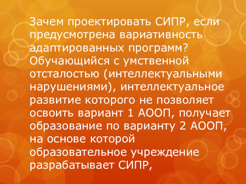 Слайд 9Зачем проектировать СИПР, если предусмотрена вариативность адаптированных программ? Обучающийся с умственной