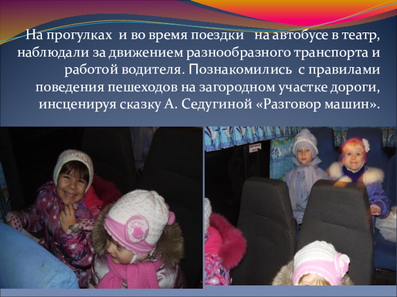 наблюдали за движением разнообразного транспорта и работой водителя. Познакомились с правилами поведения пешеходов на загородном участке дороги, инсценируя сказку А. Седугиной «Разговор машин».