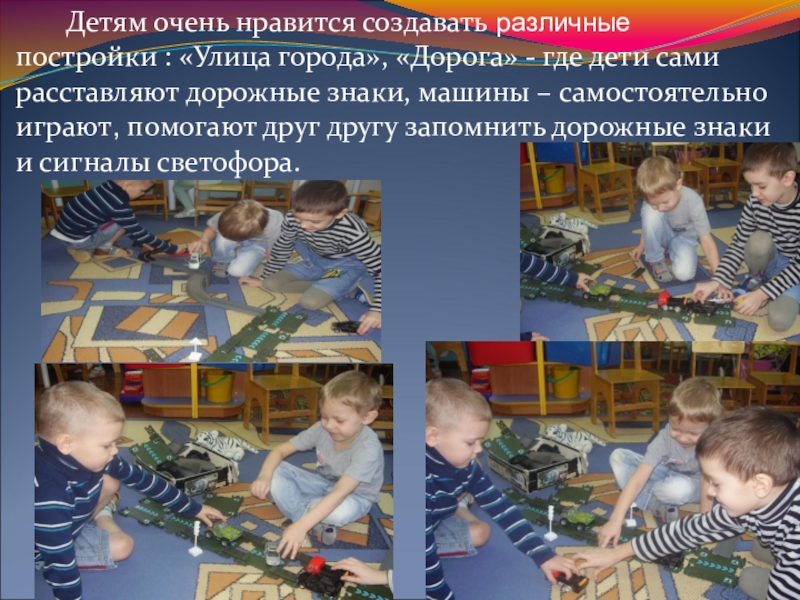 «Улица города», «Дорога» - где дети сами расставляют дорожные знаки, машины – самостоятельно играют, помогают друг другу запомнить дорожные знаки и сигналы светофора.