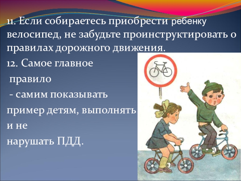 Слайд 2511. Если собираетесь приобрести ребенку велосипед, не забудьте проинструктировать о правилах