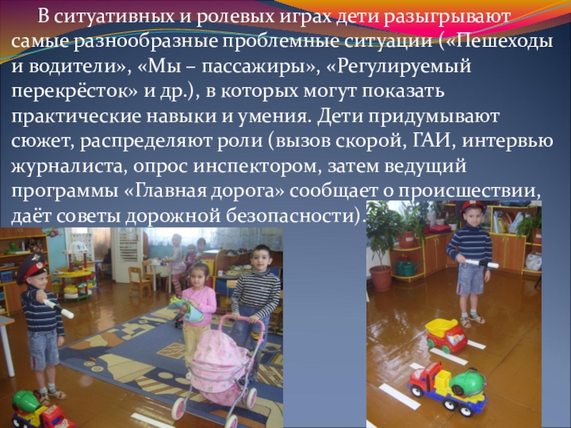 разнообразные проблемные ситуации («Пешеходы и водители», «Мы – пассажиры», «Регулируемый перекрёсток» и др.), в которых могут показать практические навыки и умения. Дети придумывают сюжет, распределяют роли (вызов скорой, ГАИ, интервью журналиста, опрос инспектором, затем ведущий программы «Главная дорога» сообщает о происшествии, даёт советы дорожной безопасности).