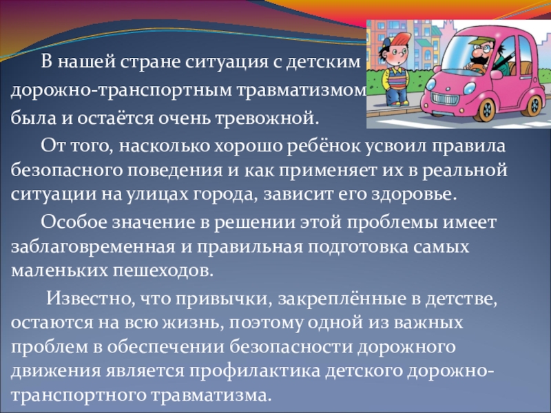 Известно, что привычки, закреплённые в детстве, остаются на всю жизнь, поэтому одной из важных проблем в обеспечении безопасности дорожного движения является профилактика детского дорожно-транспортного травматизма.