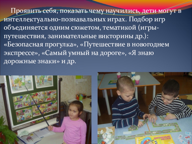 Слайд 10 Проявить себя, показать чему научились, дети могут в интеллектуально-познавальных