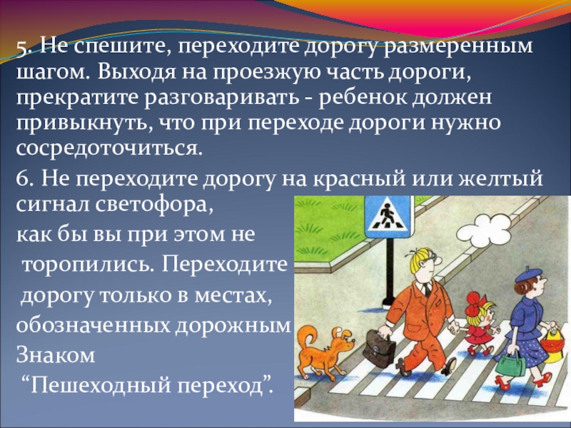 Слайд 225. Не спешите, переходите дорогу размеренным шагом. Выходя на проезжую часть