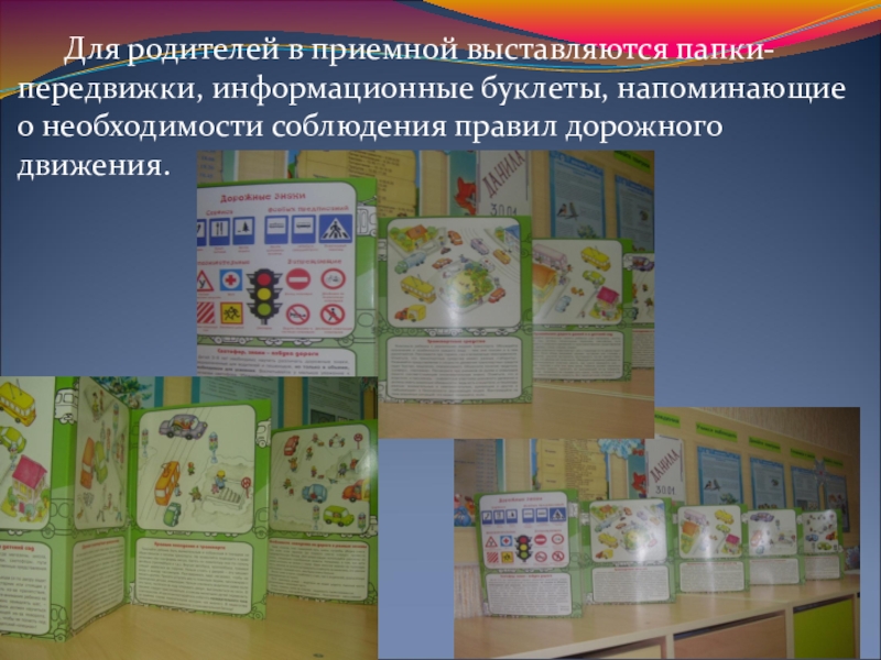 Слайд 15 Для родителей в приемной выставляются папки-передвижки, информационные буклеты,