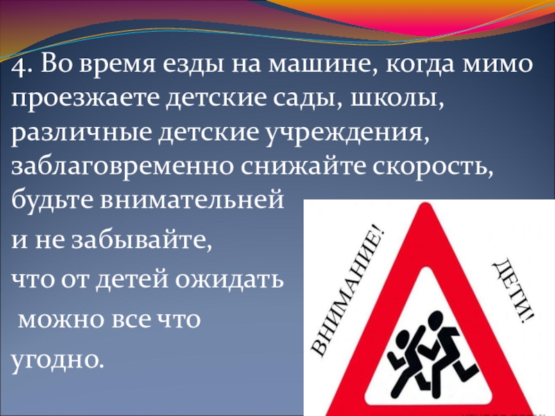 Слайд 214. Во время езды на машине, когда мимо проезжаете детские сады,